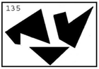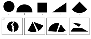 Carilah di antara bentuk-bentuk yang ditentukan (a, b, c, d, e) bentuk yang dibangun dengan cara menyusun potongan-potongan itu sedemikian rupa, sehingga tidak ada kelebihan sudut atau ruang di antaranya.