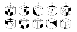 Carilah kubus yang dimaksudkan itu dan pilihlah jawabanmu yang sesuai.Kubus itu dapat diputar, dapat digulingkan atau dapat diputar dan digulingkan dalam pikiranmu, oleh karena itu mungkin akan terlihat suatu tanda yang baru.